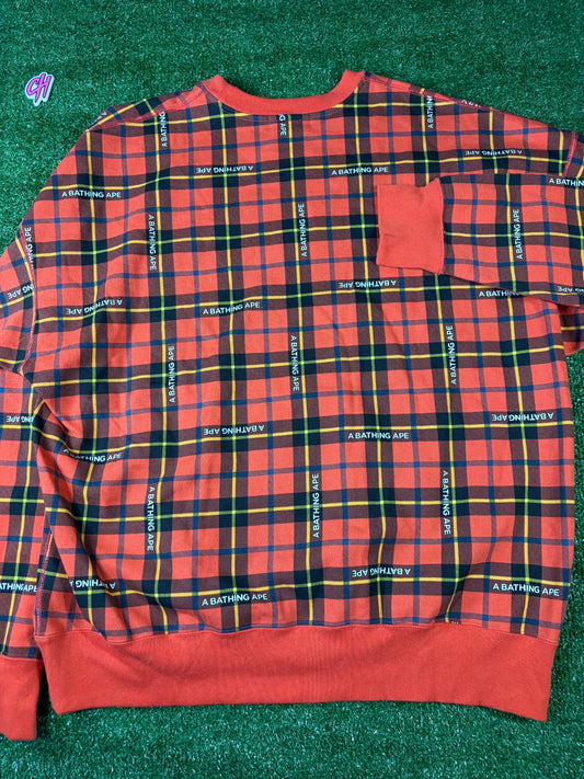 BAPE Logo Check Red Loose Fit Crewneck Sweater Size XL