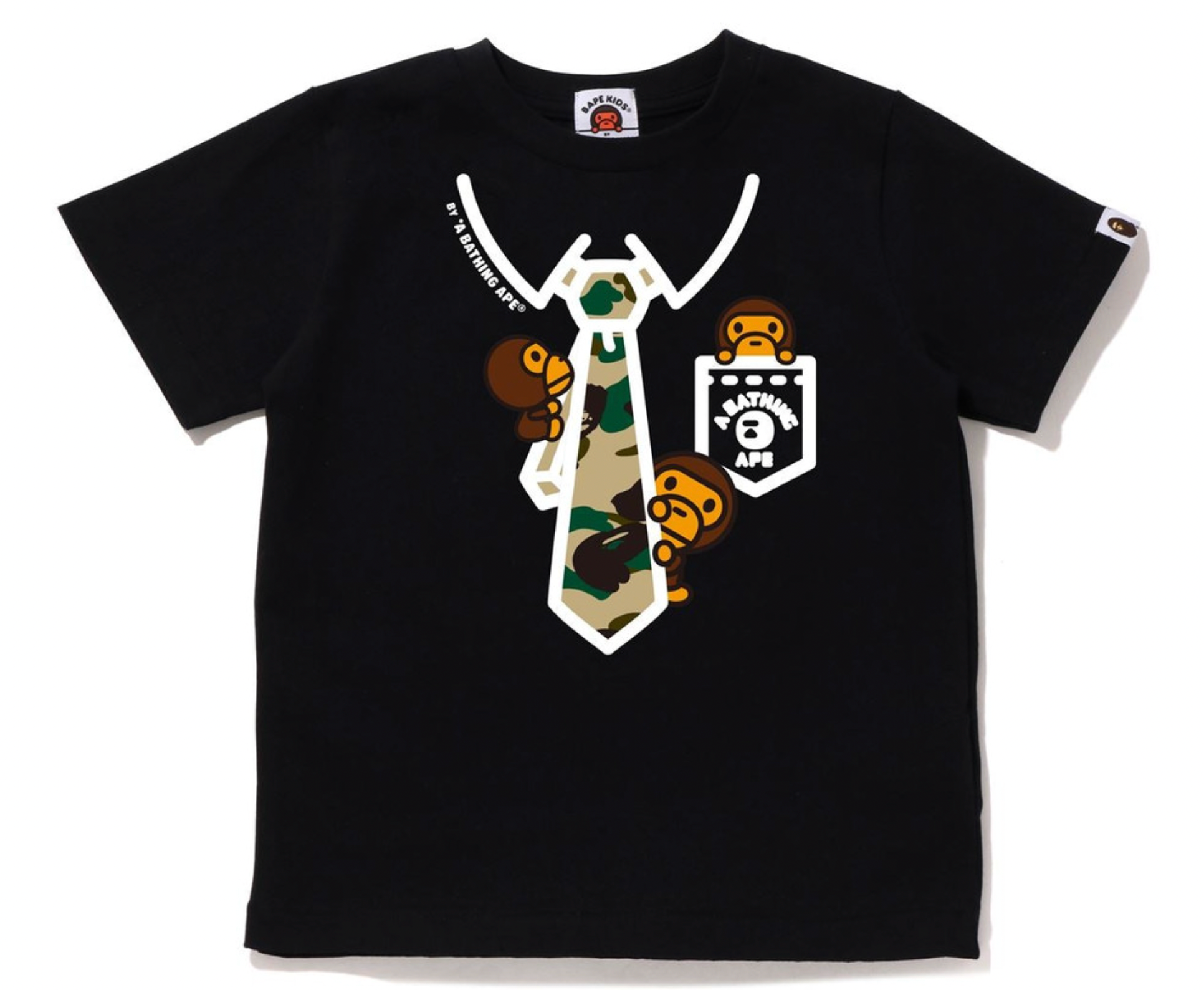 Bape Kids 1st Camo Baby Milo Neck Tie Print Black T-Shirt Size 90